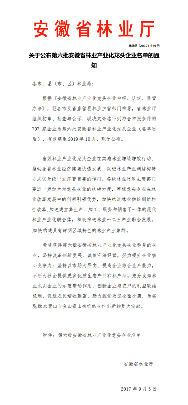 關(guān)于公布第六批安徽省林業(yè)產(chǎn)業(yè)化龍頭企業(yè)名單的通知